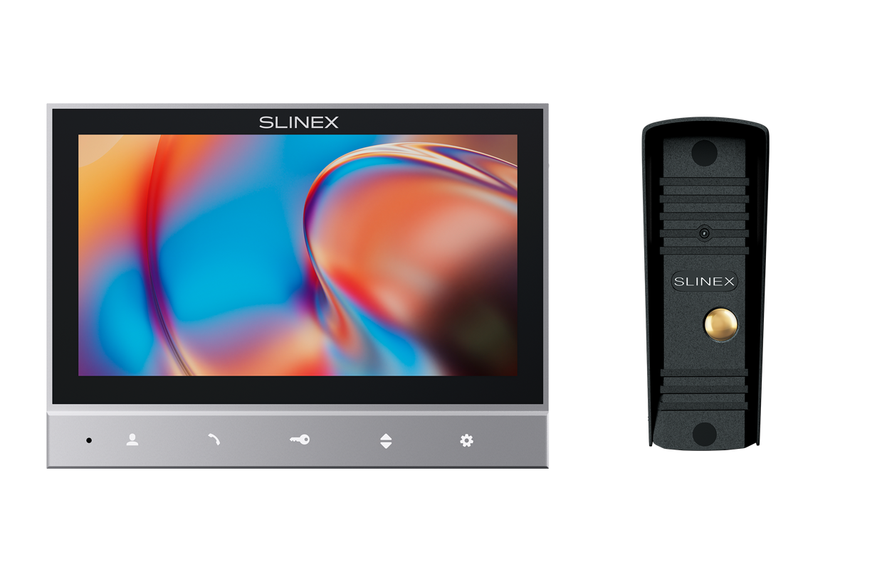 Цветной настенный видеомонитор с 7″ TFT LCD экраном формата 16:9, разрешение 1024×600. Сенсорные клавиши с подсветкой, встроенный блок питания. Формат – CVBS (PAL или NTSC). Память – нет. Поддержка 1-й вызывной панели. Питание: ~100–240 В или +13,5 В, потребление до 6 Вт. Размеры: 176×129×23 мм.