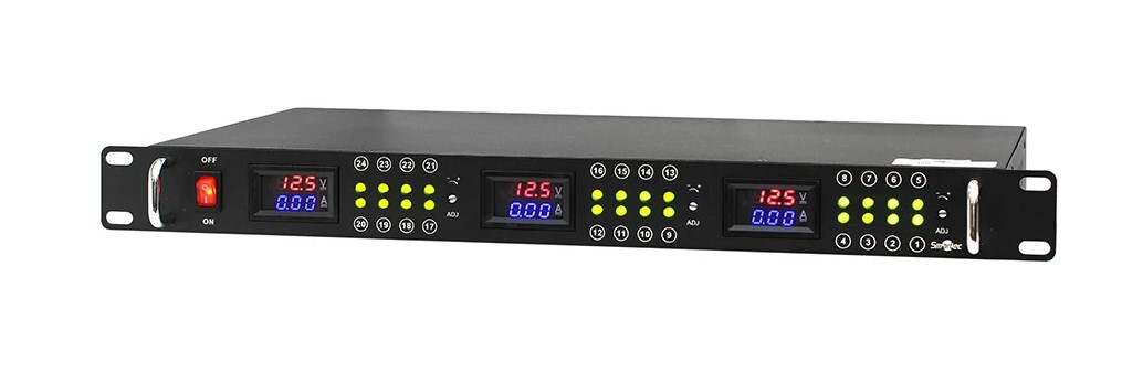 ST-PS130RM-BK – блок  бесперебойного питания в стойку 19”, оснащенный 24 выходными каналами, каждый из которых имеет самовосстанавливающиеся предохранители для обеспечения индивидуальной защиты. Эти каналы разделены на 3 группы по 8 штук, для каждой из которых возможна регулировка выходного напряжения, а его текущие значения выводятся на 3 цифровых дисплея (по одному на группу). Кроме того, этот блок питания оборудован стабилизатором напряжения и способен защищать подключенные устройства от короткого замыкания и перегрузки, а для удобства мониторинга состояния линии 220 В и выходных каналов на корпусе ST-PS130RM-BK имеются светодиоды.