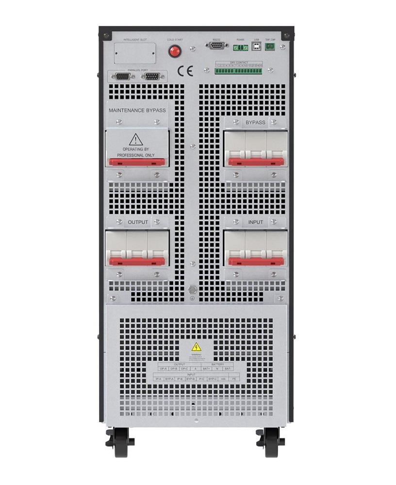 Трехфазный моноблочный ИБП напольного исполнения мощностью 60 кВА. Высокоэффективный транзисторный выпрямитель обеспечивает низкий коэффициент искажений входного тока, плавный запуск и возможность отсрочки включения. Бестрансформаторный инвертор обладает единичным коэффициентом мощности и высоким значением КПД. Данная модель ИБП применяется для обеспечения бесперебойной работы серверных небольшой мощности, систем автоматики и КИПа, систем сигнализации, видеонаблюдения, аварийного освещения. Возможна работа в параллельном режиме до 4-х ИБП. Модель TRIOMT60A0 работает только с внешним батарейным массивом. В комплект поставки входят температурный датчик, кабель параллельной работы и интерфейса RS232, руководство по эксплуатации.