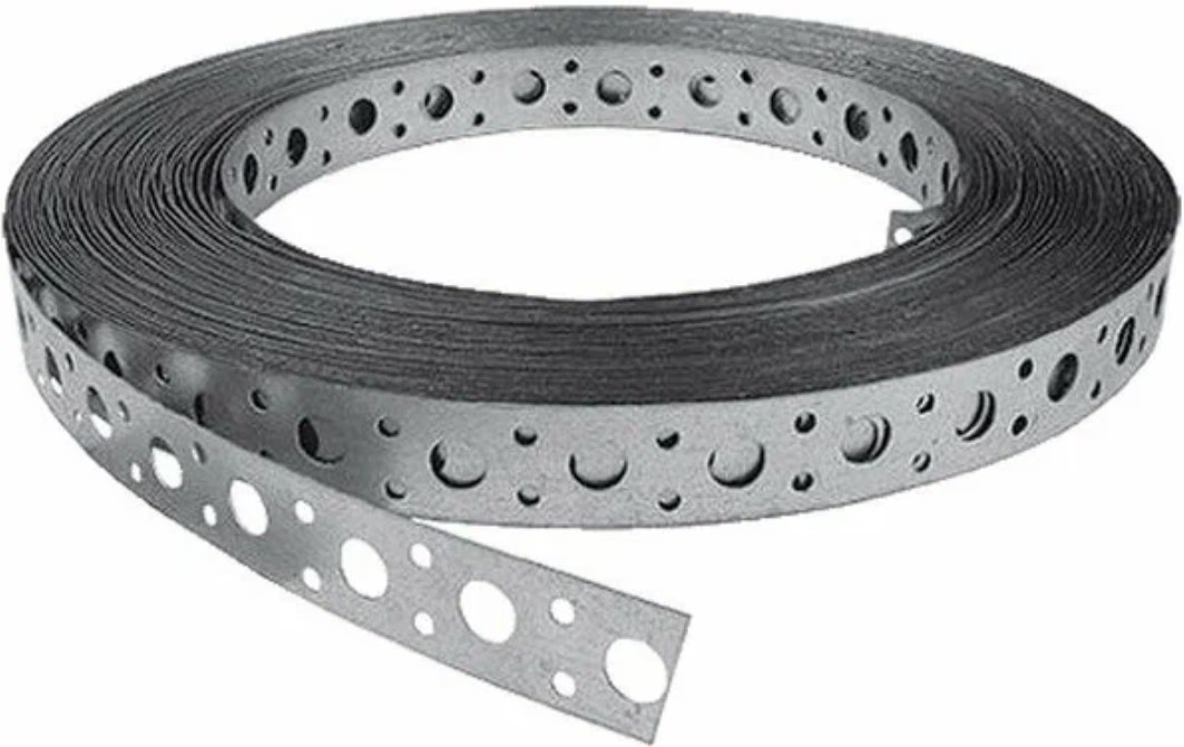 Представляет собой тонкую стальную полосу, с круглой перфорацией в 3 ряда, длиной 25 м, шириной 20 мм, толщиной 0,7 мм. Изготовлена из нержавеющей оцинкованной стали.
