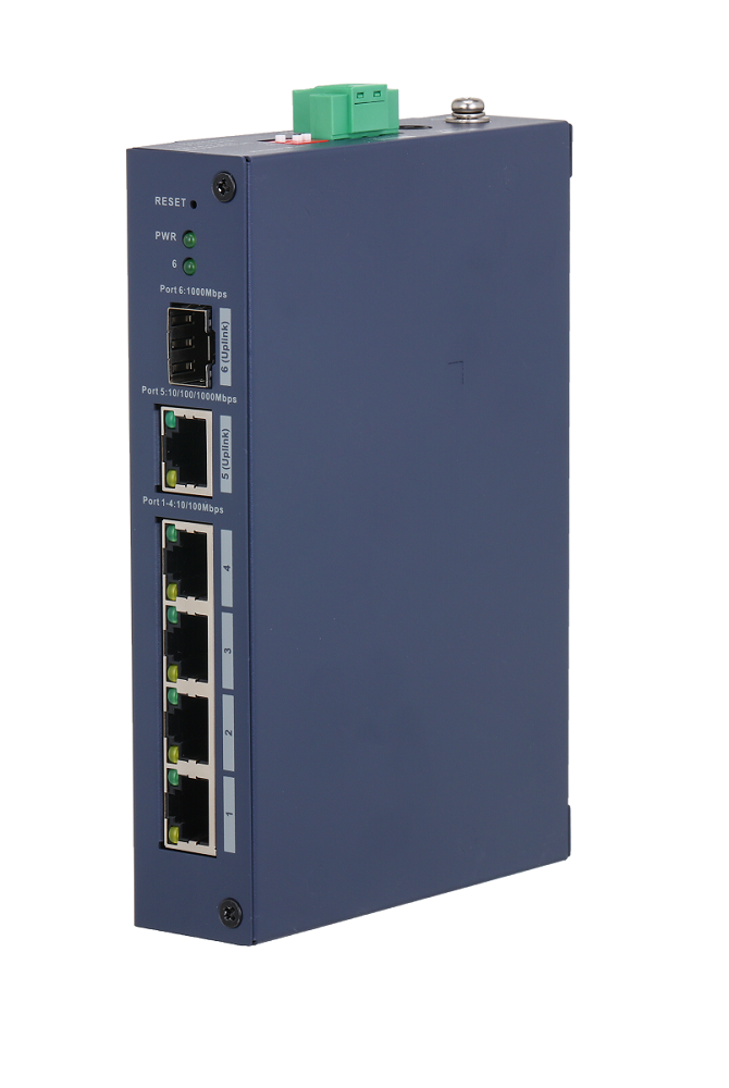 Порты: 4 RJ45 10/100Мбит/с, 1 RJ45 10/100/1000Мбит/с (uplink), 1 SFP 1000Мбит/с (uplink); питание: 12В(DC); грозозащита: до 6кВ; рабочая температура: -30°С~+65°С; IP30, IK06; монтаж на DIN-рейку.