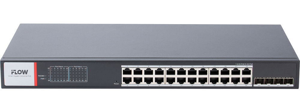 L2, 24 гигабитных портов RJ45 PoE, 4 гигабитных порта SFP,  802.3af/at/bt, порты 1-4 поддерживают Hi-PoE 90 Вт, бюджет мощности PoE 480 Вт, облачное управление, VLAN, STP/RSTP /ERPS loop prevention, поддержка режима передачи до 300 м (10Мбит/с, CAT6), поддержка режима передачи до 300 м (10Мб/с, CAT6), защита от перенапряжения 6 кВ, температурный диапазон -40°C to 75°C, металл, стоечный монтаж (19")