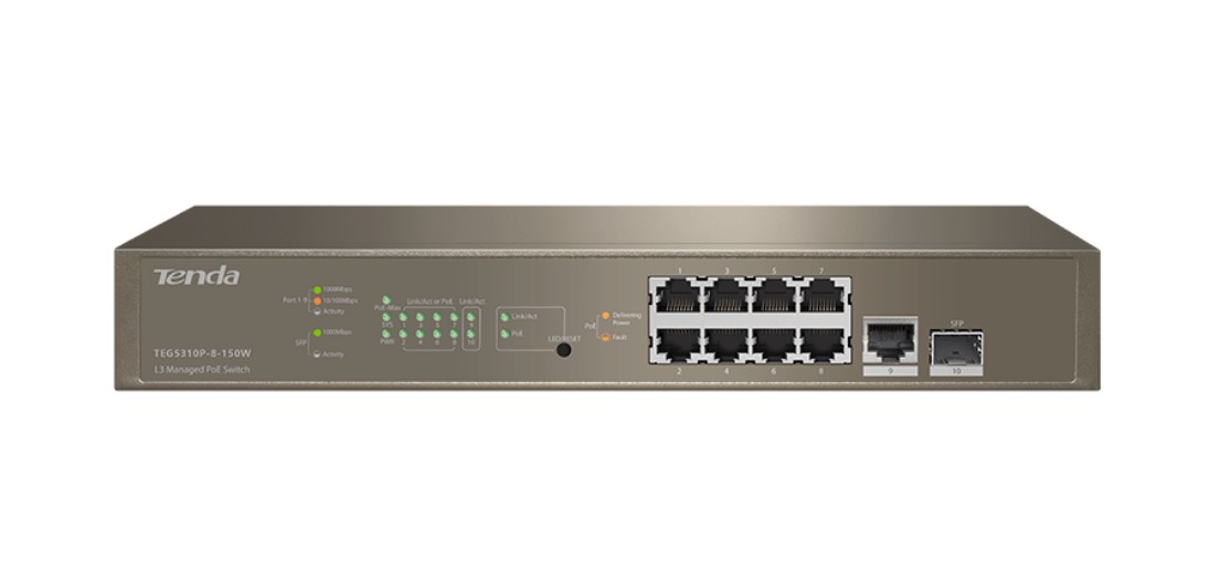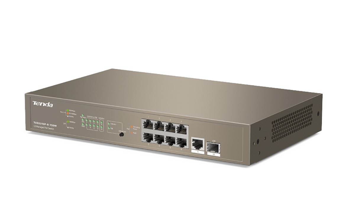 TEG5310P-8-150W — это управляемый PoE-коммутатор третьего уровня (L3) от Tenda, предназначенный для высокоэффективного подключения и распределения ресурсов сети. Устройство оснащено восьмью гигабитными портами Ethernet с подачей питания (PoE) суммарной мощностью до 130 Вт и одним дополнительным гигабитным интерфейсом плюс модулем SFP.