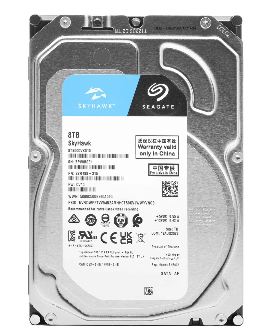 Жесткий диск Seagate Skyhawk ST8000VX010, 8ТБ, HDD, SATA III, 3.5". Объём накопителя составляет 8 ТБ. Технология записи CMR гарантирует стабильную скорость независимо от объема данных. Устройство предназначено для круглосуточной работы в системах видеонаблюдения.